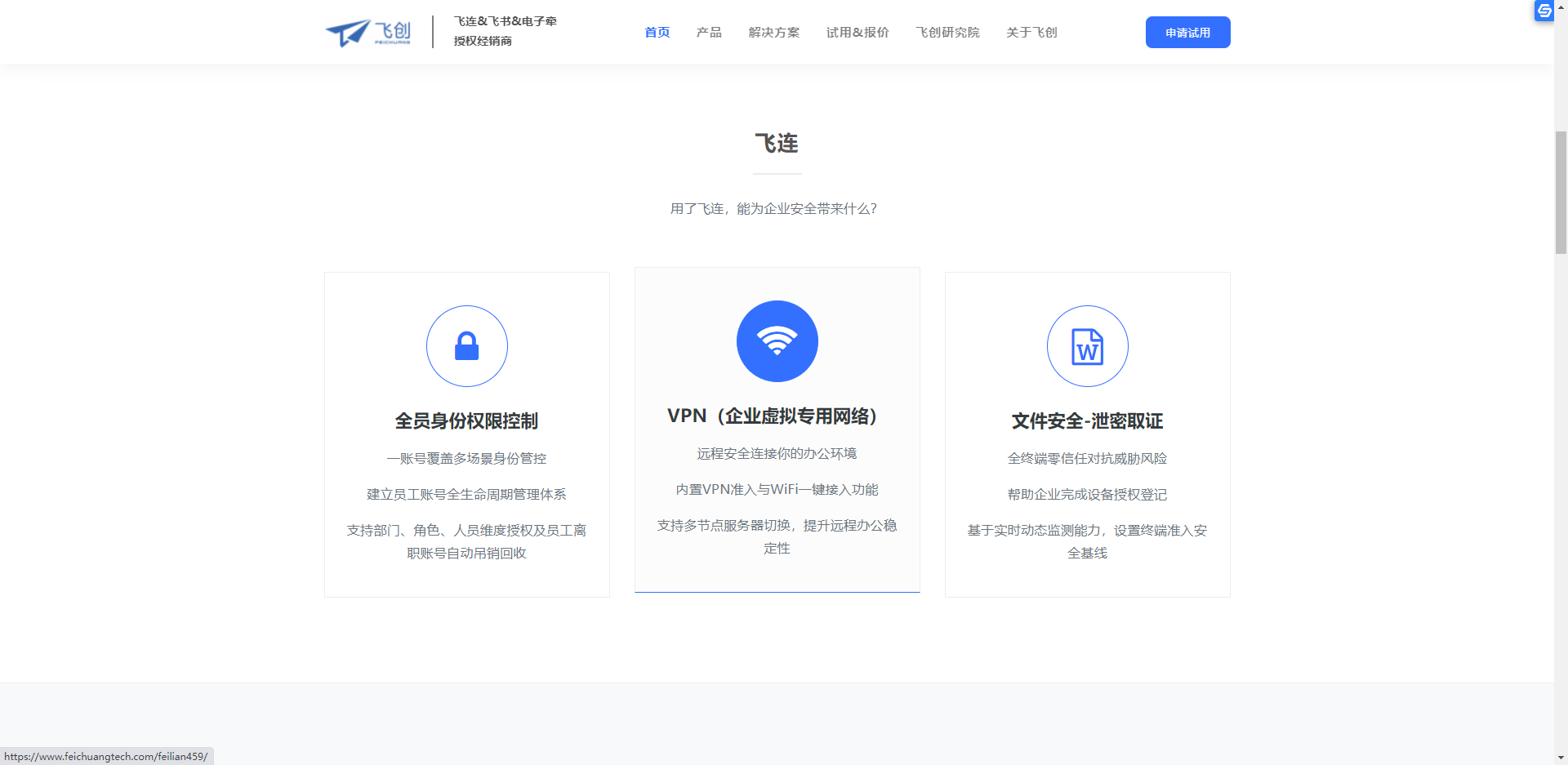 飞连是一款集身份认证、VPN链接、信息防泄漏、办公网络管控、防病毒等功能为一体的数字化办公平台,能够帮助员工安全连接企业网络、设备和办公应用,有效的**公司的数据资产。
